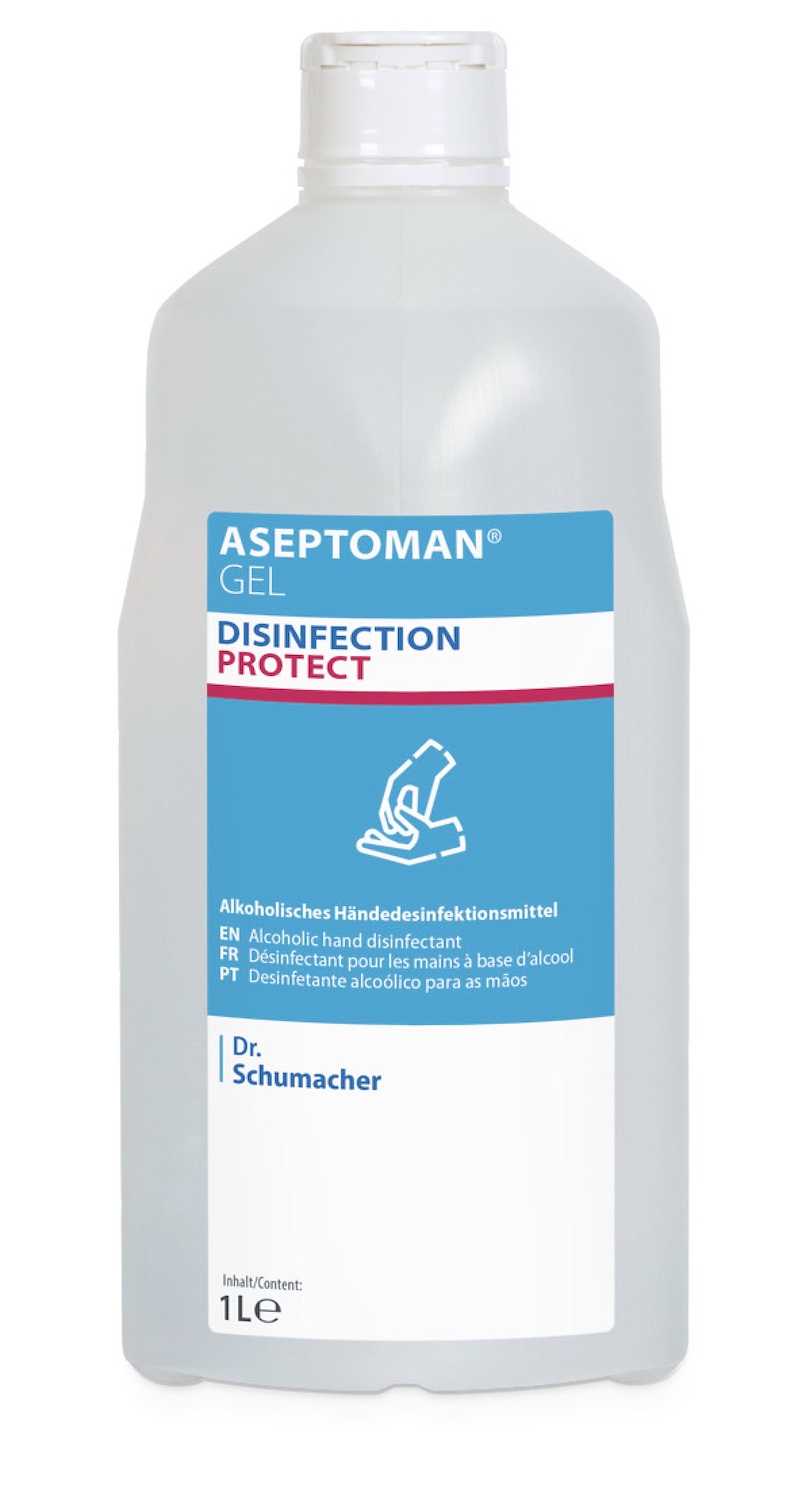 Aseptoman gel - alkoholový dezinfekční gel, který se vtírá do pokožky rukou. Gelový roztok umožňuje přesné dávkování a jednodušší aplikaci bez stékání. Kompatibilní se všemi mycími roztoky.