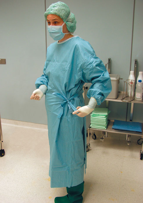 Operační plášť je sterilně balen, má modrou barvu a je vyroben z vlísu, ze kterého se neuvolňují vlákna (směs celulózy a polyesteru).