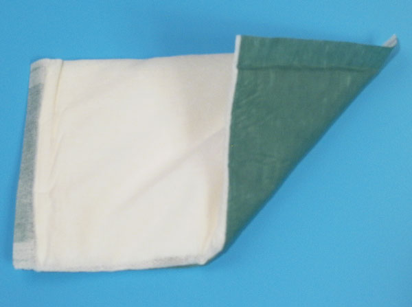 Vysoce savé krytí na ránu je opatřeno na straně, která nepřiléhá k ráně, pro tekutiny neprostupným zeleným vlísem.