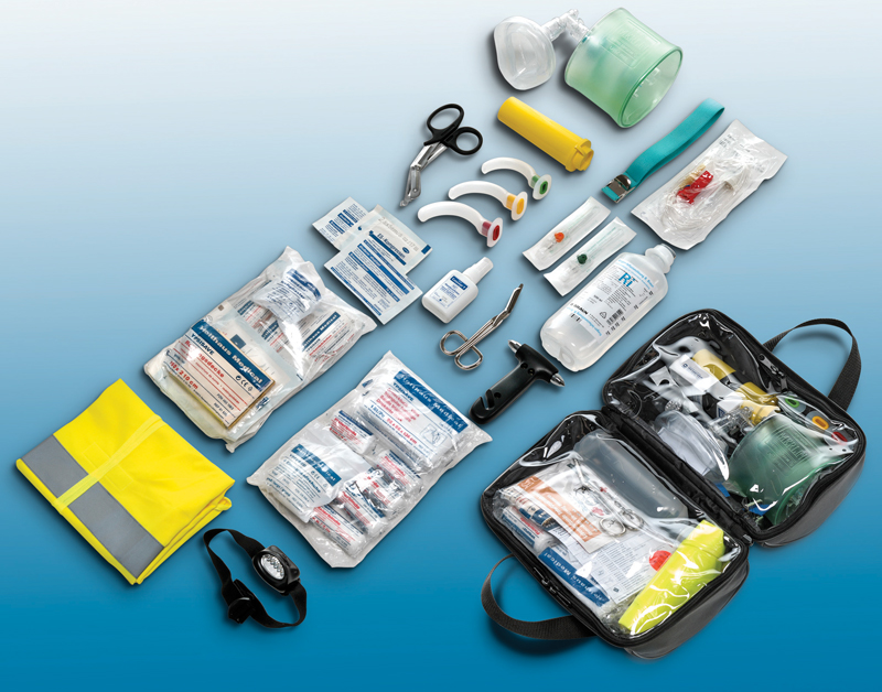 1 resuscitační vak "ambuvak" s maskou 3 ústní vzduchovody (velikost 2, 3 a 4) 1 škrtidlo 1 dezinfekční sprej se sterilními čtverečky 2 intravenózní flexily 1 fixační náplast pro fixaci flexil 1 box na použité jehly 1 infúzní soupravu 1 nůžky na roztřižení oděvu 1 reflexní vestu 1 kladívko pro rozbití okna vozidla s integrovaným nožem pro přeřezání pásů 1 čelní svítilnu 1 sortiment obvazů podle normy DIN 13164