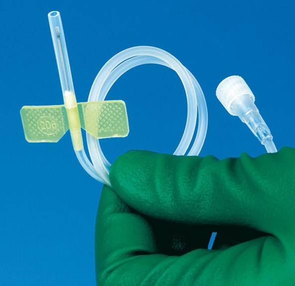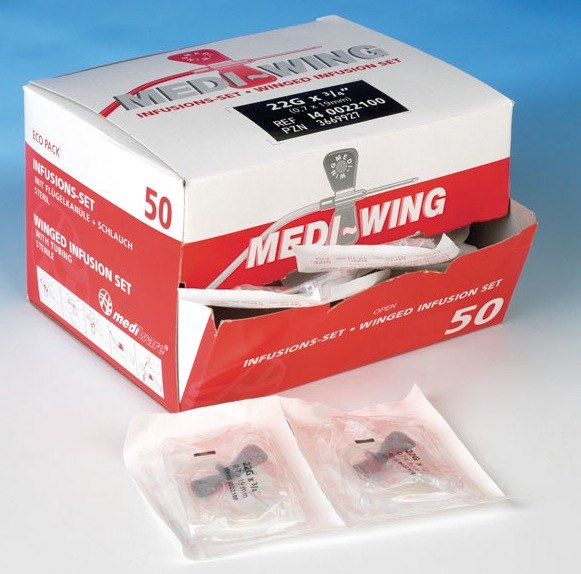 Křídlatá jehla s hadičkou, ostrá kanyla, jednotlivě sterilně balena, koncovka Luer Lok, barevné kódování průměrů.