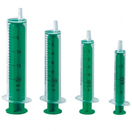 Značkové sterilní dvoudílné stříkačky se zeleným pístem.