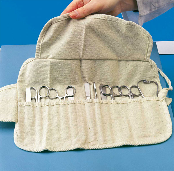 Souprava obsahuje 9 nástrojů: jehelec, chirurgické nůžky rovné, nůžky na stehy, chirurgické nůžky zahnuté, pinzeta na úlomky, chirurgická pinzeta, anatomická pinzeta, 2 držáky skalpelů.