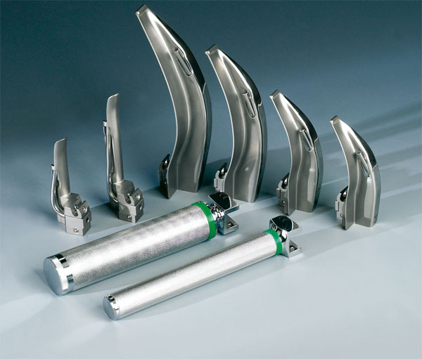 Laryngoskopy s halogenovým osvětlením a světlovodnými vlákny.