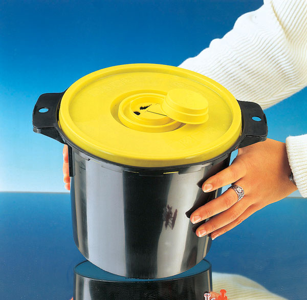 Objem 11000 ml, výška 25 cm, průměr dole 23 cm, průměr nahoře 26 cm, nádoba je vhodná pro jehly i stříkačky, barva nádoby černá, víko žluté.