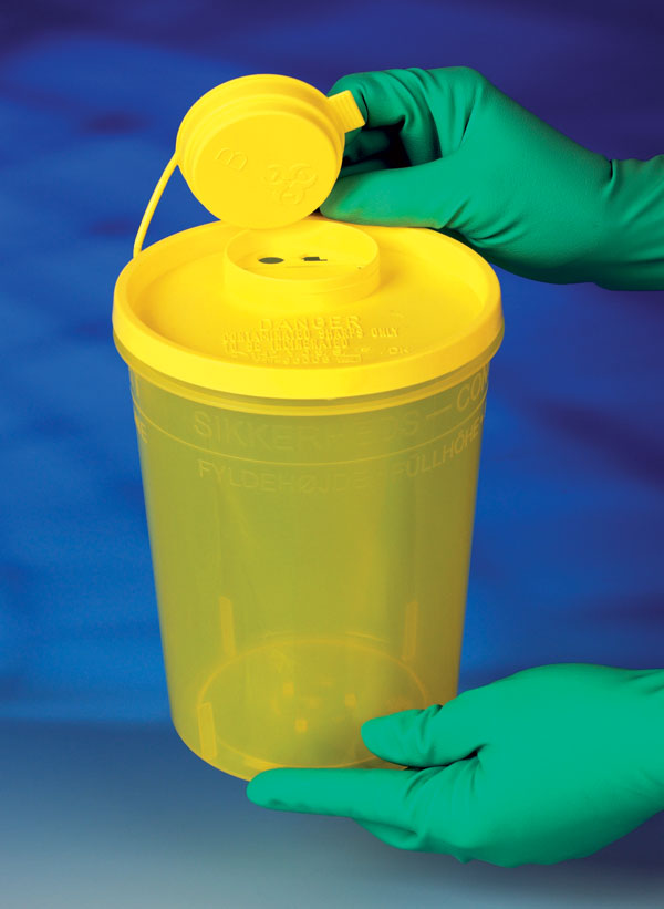 Zářez pro snadné sejmutí jehly, další zářez pro sejmutí inzulinové jehly PEN, záklopka bránicí vypadnutí infikovaných předmětů, u větších nádob další záklopka pro vložení stříkaček, křídlatých jehel nebo většího odpadu, jehlou nepropíchnutelný pevný plast, označení maximálního plnicího objemu, bezpečnostní hermetický uzávěr.