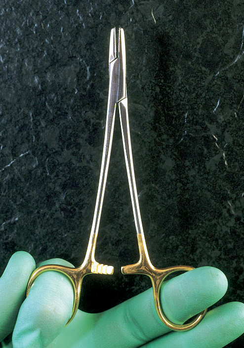 Jehelec, Hegar-Ohlsen, s nůžkami, tvrzená ocel WIDIA, pozlacená rukojeť, 145 mm