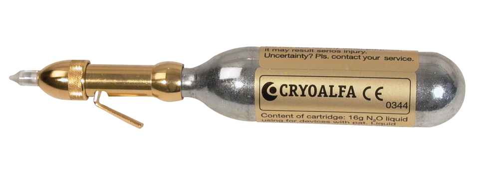 Nový kryoterapeutický přístroj používá zdokonalené ocelové lahvičky s tekutým N2O, které obsahují ventil.